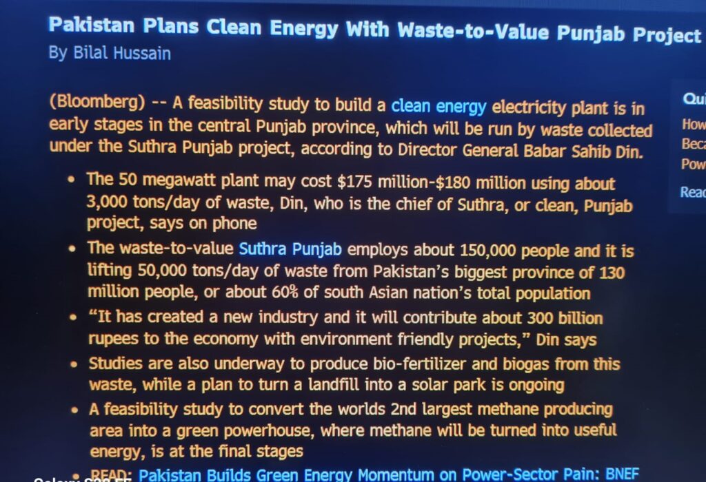 فوبز کے بعد اب بلومبرگ نے بھی اپنی رپورٹ میں صوبے کے ویسٹ ٹو ویلیو منصوبے کو قابلِ قدر قرار دیا ہے۔ بلوم برگ نے اپنی خبر میں بتایا ہے کہ پنجاب کے مرکزی علاقے میں صاف توانائی پیدا کرنے کے لیے 50 میگاواٹ کے جدید پاور پلانٹ کی ابتدائی فزیبلٹی اسٹڈی جاری ہے۔